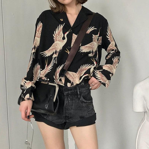 原宿系鶴柄長袖シャツトップス気質レデイース