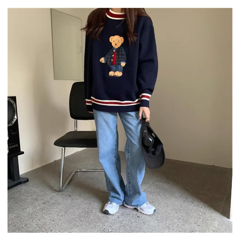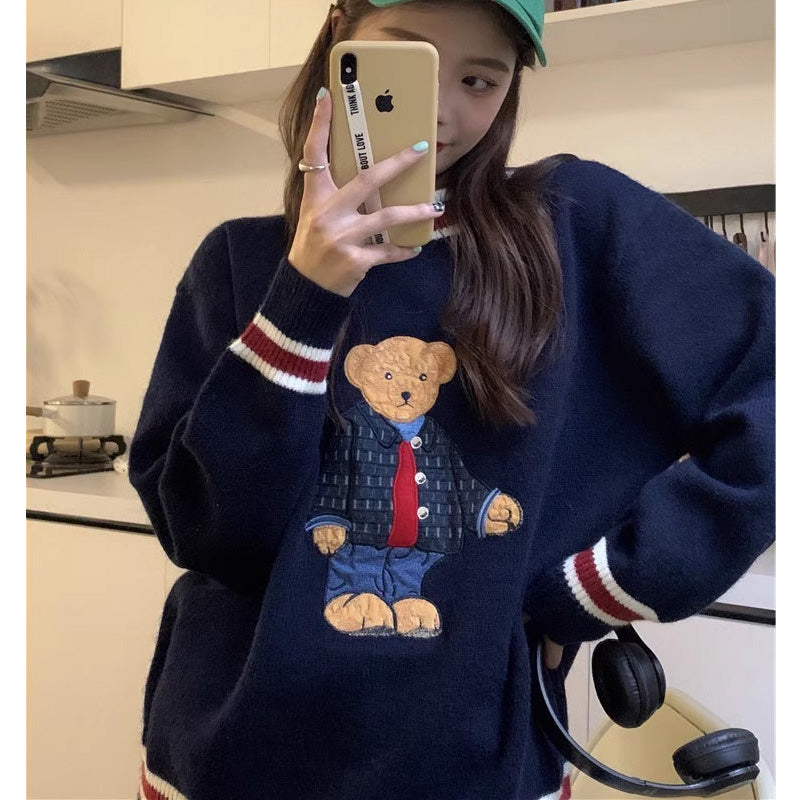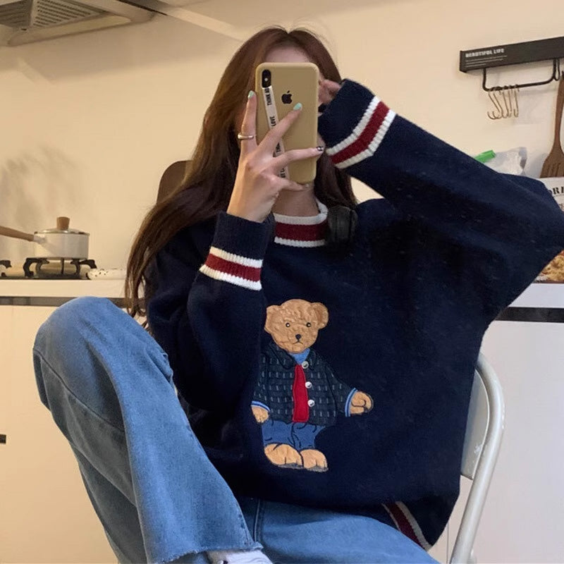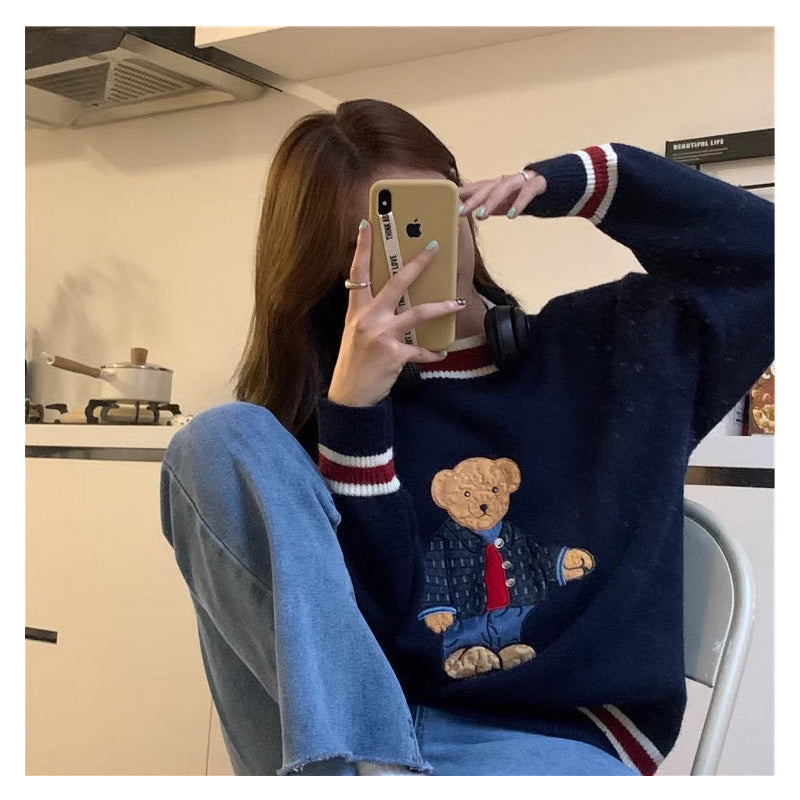 かわいい韓国っぱ刺繍入りベアカラーブロック ストライプVネックニットセーターレデイーズ